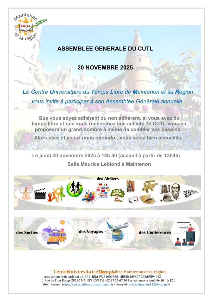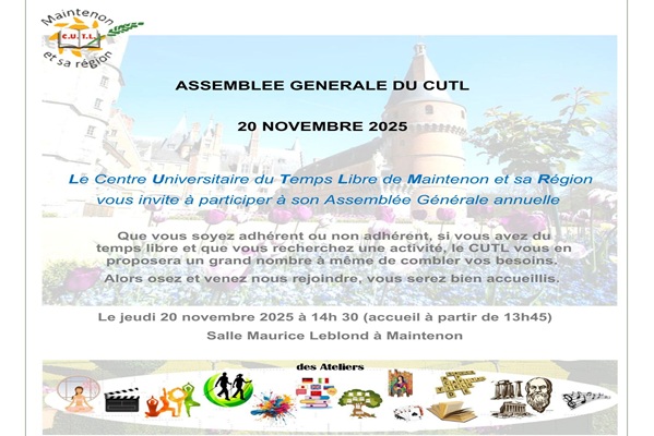Le Centre Universitaire du Temps Libre de Maintenon et sa Région (CUTL) tiendra son Assemblée Générale annuelle le jeudi 20 novembre 2025 à 14h30 (accueil à partir de 13h45) à la Salle Maurice Leblond à Maintenon.