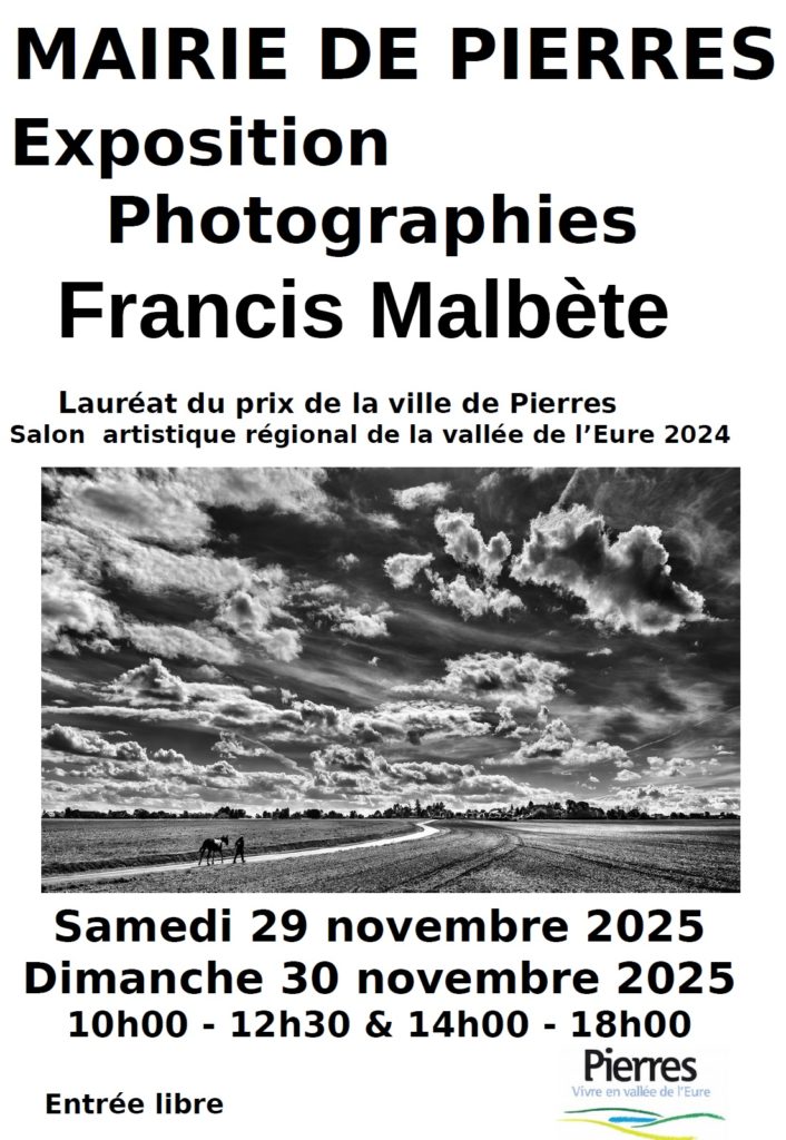 Lauréat du prix de la ville de Pierres au Salon artistique régional de la vallée de l’Eure 2024, Francis Malbète exposera ses photographies à la mairie de Pierres, les 29 et 30 novembre prochain.