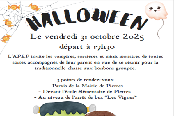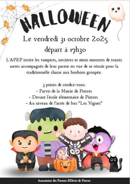 L’Association des Parents d’Élèves de Pierres (APEP) invite tous les petits monstres, vampires, sorcières et fantômes à venir fêter Halloween dans une ambiance terrifiante… mais surtout conviviale !